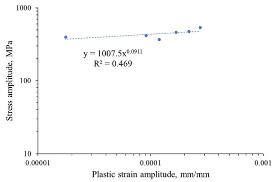 where K′ is the cyclic amplification factor and n′ is the exponent of cyclic amplification. The plastic strain amplitude and stress amplitude are not constant during fatigue testing; therefore, only their stabilized values, which are taken into consideration, allow us to describe the cyclic properties in most of the low-cycle fatigue life. The discussed equation connects the plastic strain and stress amplitude for the stabilized state based on the Ramberg–Osgood relationship, and the established parameters are considered to be constant for the tested material. The values of the equation are shown in the graph (Figure 7) and in Table 2.