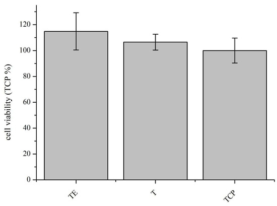 The cytotoxicity study on pure titanium materials after explosive deformation (TE) performed in relation to the control material—pure titanium without explosive deformation (T)—showed the lack of cytotoxicity of both materials. In comparison to the pure culture medium (TCP), the control showed slight differences in favor of both titanium materials; however, they are not statistically significant, as can be seen in the graph below (Figure 10). Error bars represent standard deviation values. Cytotoxicity, according to ISO 10993-5 [31], is stated for materials for which the result of the viability test is less than 70% of the value obtained for the control sample. The in-vitro test shows the lack of cytotoxicity of pure titanium after explosive deformation.