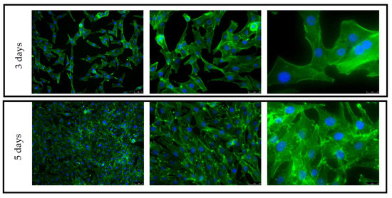 For the purpose of this study, in direct contact with the material, cell culture was carried out for 3 and 5 days. The same cell seeding density was used for both time points, and seeding on both the top and side surfaces of the samples was used to evaluate the effect of the strain force direction on the cellular response. The samples were placed in the wells of 24-well plates and then seeded with cells with a density of 5000 cells per cm2 on all the tested surfaces (XY and XZ1). After 3 and 5 days, the culture plates were removed from the incubator and then fixed with a 3% formaldehyde solution and fluorescently stained. The cell nuclei were stained using NucBlue™ Fixed Cell ReadyProbes, which emit light with a maximum intensity at 460 nm with excitation at 360 nm. The actin skeleton was stained using ActinGreen™ 488 ReadyProbes, which emit light with a maximum intensity at 518 nm when illuminated with a light beam with a wavelength of 495 nm. Fluorescence microscopy images were taken for each culture in three magnifications: 10, 20 and 63 times (Leica DMI3000B, Wetzlar, Germany).