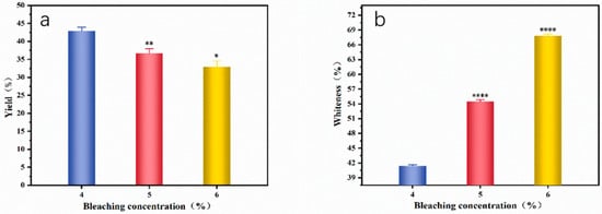 The effect of bleaching concentration on the yield (a) and whiteness (b) of corn stalk pulp. Stars represent a significant difference (p < 0.05), specifically, *, **, and **** mean 0.01 < p < 0.05, p < 0.01, and p < 0.0001, respectively.