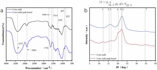 Infrared curve (a) and XRD spectrum (b) of corn stalk pulp board.