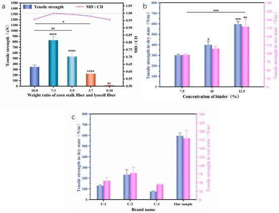 Mechanical properties of wet wipes. (a) The breaking strength and longitudinal and transverse strength ratio of the fiber web with different fiber ratios. (b) The effect of different adhesive concentrations on the mechanical properties of wet wipes. (c) The strength comparison of commercially available flushable wet wipes with our samples. Stars represent a significant difference (p < 0.05), specifically, *, **, ***, and **** mean 0.01 < p < 0.05, p < 0.01, p < 0.001, and p < 0.0001, respectively.