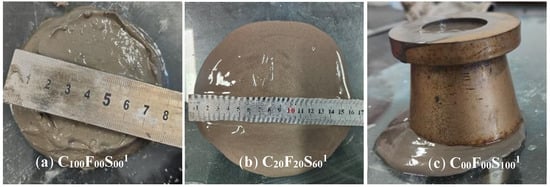 Figure 2 shows the fluidity test results of the cement paste with different amounts of FA and SSP. C100F00S00 indicates that the FA and SSP amounts are both 0%, i.e., this group was the pure cement control group. As shown in Figure 2, with different water-to-binder ratios, the experimental groups with a w/b of 0.45 had a higher overall fluidity than the experimental group with a w/b of 0.40. However, the FA and SSP admixture had a similar impact on the changes in the fluidity of the cement paste. With the increase in SSP, because of the inert substance and low activity, the fluidity increased linearly. The combined effect of FA and SSP resulted in a paste fluidity that was similar to that of pure cement, thus playing a role in regulating the fluidity of the cementitious materials. Consistent with the experimental results obtained by Liu et al. [31], the addition of ordinary SSP increased the workability of the mortar. Under the same w/b, taking a w/b of 0.45 as an example, the fluidity of the cement paste with 20% of FA alone increased by 5 mm compared with that of C20F20S601 (75 mm). The fluidity of C60F20S201 was 138 mm, which increased by 63 mm compared with that of C100F00S001, and 58 mm compared with that of C80F20S001. However, the fluidity of C20F20S601 was 164 mm, which was 89 mm greater and 2.19 times that of C100F00S001. Therefore, both the FA alone and FA–SSP mixture could increase the fluidity; however, compared with the SSP, the mixing of FA further enhanced the effect of FA on the regulation of the fluidity of the cement paste. In terms of the test results, as shown in Figure 3c, for C100F00S1001, that is, when the SSP content was 100%, there was water secretion in the paste, mainly due to the lower water absorption of the SSP relative to the cement. In comparison, the steel slag had a lower activity, and it was only involved in the reaction when the aging duration was longer [32]. Thus, the combination of FA and SSP promoted the fluidity, which relatively increased the water content in the paste, and after reaching a certain admixture content, the paste flow was too high. At this time, the effect of SSP on improving the fluidity of the cement paste was unfavorable.