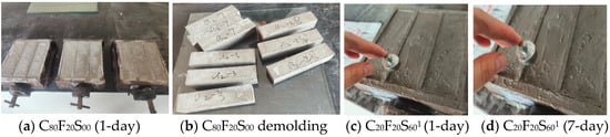 Table 4 presents the experimentally measured flexural and compressive strength data. When w/b was 0.45, C20F20S601 was cured to a 1-day mold removal age. When the sample could not be sufficiently formed, it was extended to a two-day mold removal age, and its 7-day strength was almost 0 MPa. Figure 6 shows the test phenomenon, where the images a and b show the normal mold removal and molding state of the composite paste C80F20S00, and the figures c and d show the mold removal state of C20F20S601. Clearly, the inside of the sample was still not completely consolidated, resulting in a low sample strength. Therefore, data for the test groups with 60%SSP and higher were not provided in this paper.