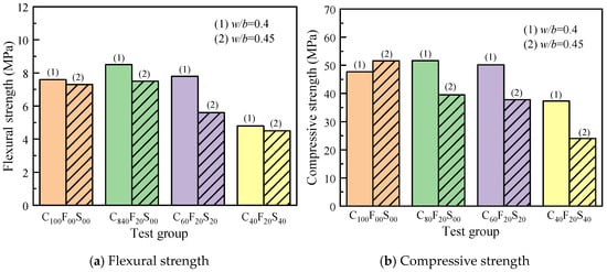 Figure 9 shows the results of the effects of the w/b on the flexural and compressive strengths of the test groups at the same curing age. The 28 d compressive strength of the net cement paste samples with a w/b of 0.45 was higher than that of C100F00S00 with a w/b of 0.4, and the clean paste test groups containing SSP showed better mechanical properties than the test groups with a lower w/b.