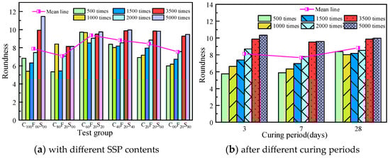 Figure 14 shows the variation in the mean roundness of the paste samples. Figure 14a shows the change in the average roundness of the samples with different FA–SSP compound dosages at different magnifications. The overall average roundness is in the range of 7–10, which is quite different from the standard value of 1, which indicates a circular shape, that is, the greater the difference between the obtained shape and the circular shape, the lower the impact of the replacement rate of the SSP on the roundness of the paste. The change law of the mean line shows that the roundness value of the paste with a single FA admixture was lower than that of C100F00S00, and the average roundness value of the paste was the highest in C60F20S20, which was 9.37. In the composite paste test groups, the greater the amount of SSP, the lower the roundness value. Figure 14b shows the change in the roundness of the paste sample cured after different periods at six magnifications. The histogram and change law of the mean line show that the overall average roundness of the paste is approximately 8.00, and the line chart shows that the change in the average roundness value is less, there is less volatility, and the effect of the curing age on the average roundness value of the samples has a nonlinear variation.