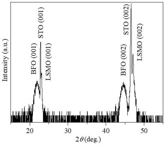 Figure 1 shows a typical XRD θ-2θ pattern for the as-prepared BFO/LSMO heterostructures on the (001) STO substrate. Only (00l)-type reflections are observed, indicating predominant (001) growth along the orientation of the substrate.