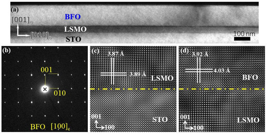 TEM image (a), SAED (b), HRTEM images near LSMO/STO (c), and BFO/LSMO (d) interface of the BFO/LSMO heterostructure.