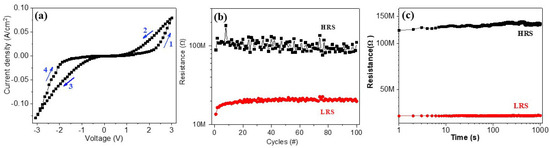 (a) I–V curve of the BFO/LSMO heterostructure under applied voltages from −3 V to +3 V, and (b) fatigue and (c) retention characteristics of the BFO/LSMO heterostructure. The numbers 1–4 in (a) indicate the sweeping sequence for the I–V curve.