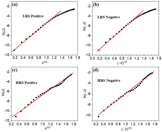 where A is the Richardson constant, Φ is the Schottky barrier height, εr is the dielectric constant of the film, and d is the sample thickness. As shown in Figure 5, linear relationships between lnJ and V1/2 indicate that the Schottky barrier controls the conductive behavior of the BFO film. In the HR state branch, linear fitting is suitable within the applied voltage range, while in the LR state branch, a linear relationship was observed in the low voltage range of 0–1.36 V.