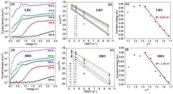 Figure 6a,d show the temperature dependence of the I–V curves in the range of 100–500 K. To further calculate the activation energy () and Schottky barrier Φ, the logarithmic of current density (ln(J/T2)) was plotted against the reversal temperature (1000/T) at various applied voltages, which are shown in Figure 6b,e. The activation energy was calculated to be 0.53–0.6 eV for the HR state, while it was 0.52–0.67 eV for the LR state. These activation energy values are identical to the activation energy of oxygen vacancies in ferroelectric oxides [30]. Furthermore, the activation energies were replotted against the square root of the voltage, as shown in Figure 6c,f. The effective barrier heights between the film and electrode were calculated as 0.43 eV and 1.18 eV for the LR and HR states, respectively. One may note that there is a slight deviation of the linear fitting in the low temperature range. In the low voltage range, the applied voltage is lower than the coercive field of the BFO film, which cannot reverse the polarization and thus results in a different barrier height. Moreover, the point defects such as bismuth and/or oxygen vacancies coupled with ferroelectric polarization would also affect the effective barrier height [31]. For a fuller understanding of it, more complex modeling may be required to accurately describe the nonlinear behavior in the entire voltage range.