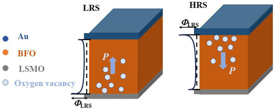 The conduction mechanism was discussed by only considering the barrier-height modulations by ferroelectric polarization [23]. However, the migration of the oxygen vacancies should be taken into consideration for further understanding the conduction mechanism. As shown in the schematic diagrams in Figure 7, with upward polarization, the downward depolarization field induces electron accumulation near the BFO/LSMO interface, reducing the width depletion region on the BFO side and thus the barrier height. Additionally, with upward polarization in the BFO layer, the Schottky barrier at the BFO/LSMO interface is the dominating factor in controlling the transport property in the Au/BFO/LSMO heterostructure. When applying a positive bias voltage, the polarization was switched downwards and the carriers were trapped near the Au/BFO interface, which then enhanced the barrier near the top Au/BFO interface. Therefore, the resistance of the heterostructure with upward polarization (downward polarization) is in an LR (HR) state. Furthermore, oxygen vacancies are frequently observed in BFO thin films [36,37] and the migration and distribution of oxygen vacancies also lead to band bending and further increase the Schottky barrier height. As shown in the schematic in Figure 7, oxygen vacancies drift toward and accumulate at the BFO/LSMO and Au/BFO interface for upwards and downwards polarization, respectively, which further enhances the Schottky barrier height for each interface, leading to LR and HR states, respectively. The proposed scenario was confirmed by the above I–V curve fitting, as well as the calculated Schottky barrier values of 0.43 eV and 1.18 eV for the LRS and HRS in Figure 6, respectively.