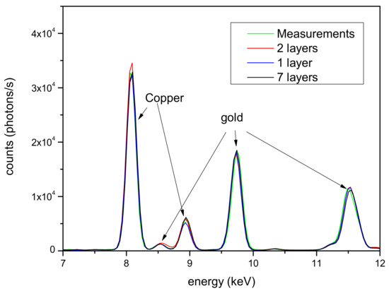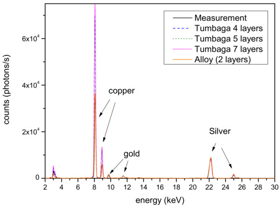 Even the gold side of the artifacts was simulated according to different models, ranging from a single layer to seven layers. In Figure 4, a comparison of some of these configurations is presented. Only the part of the spectra where the differences are more significant (7–12 keV), corresponding to the copper and gold peaks, is reported, although smaller differences are also observed for the silver peaks. The Tumbaga seven-layer model performs better than others when compared to the experimental spectrum, and both are shown in Figure 5. Even in this clearly different case, performance similar to that observed with the silver alloy is noticed, confirming the capability of the Monte Carlo simulation to discriminate Tumbaga (whether it be silver or gold-based) from simpler multilayer structures.