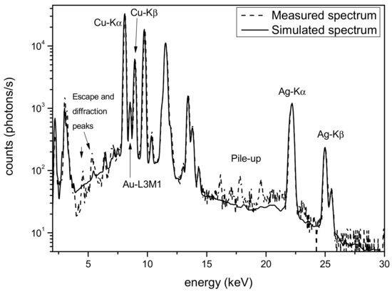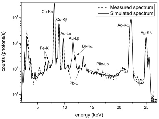 However, placing the detector far away means experiencing air attenuation in the tube–detector path. Attenuation can be mathematically corrected provided there is a sufficient number of photons reaching the detector, which does not occur for lower energies, such as in the case of the X-ray tube used here with a rhodium anode, for the L fluorescence lines emitted by the tube. In general, the absence, and therefore, the low likelihood of simulating low-energy X-ray tube emissions is not a major issue unless the concentrations of light elements, such as sulfur, or the fluorescence emissions of heavier elements at low energy, for example, the silver L lines when the K lines, are not available. In the measurements considered here, light elements or low-energy emissions are not important, except for the silver L lines. Thus, to obtain a well-characterized spectrum of the tube emission, an iterative procedure was adopted. Measurements were taken on a reference bronze sample under the same experimental conditions that would later be used for measurements on the Moche artifact. The measurement of the tube emission in air at a 1.2 m distance, corrected for attenuation introduced by the air itself, was used as the input for the Monte Carlo simulation of the experimental measurement. The spectrum obtained, for the above-mentioned problems, is not an accurate reproduction of the measurement. Therefore, the tube spectrum was iteratively corrected until a perfect simulation was achieved. When this happens, the spectrum of the tube obtained is a good representation of what is actually emitted. This long and complex process must be repeated whenever the tube’s operating voltage is changed. In theory, it is possible to take other approaches, such as simulating the operation of the tube itself based on data provided by the manufacturer, always using Monte Carlo. This approach would allow us to obtain emission spectra for each energy at the cost of simulation time (which is very long, in the order of a week). However, as mentioned before, it is conditioned by the availability of the technical data of the X-ray tube from the manufacturer, which are not often available. Currently, we are also exploring this path, but this approach was not used in this work.