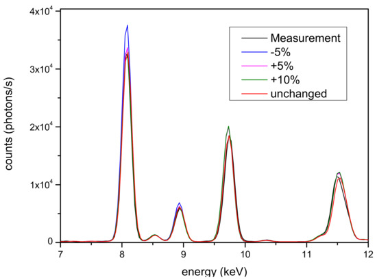 Using a traditional Monte Carlo code, i.e., a general-purpose one, even if created for the interaction of photons with matter, the execution of a single cycle would require from a few hours to several days of simulation, effectively rendering this approach impractical [12,13,14]. To address this type of issue, some fast Monte Carlo methods have been developed based on so-called variance-reduction techniques [15,16,17,18,19]. In this work, we utilized the code called XRMC [19]. It allows for simulating any type of X-ray experiment up to about 100 keV, from X-ray Fluorescence to phase-contrast tomography, to give two examples. In our case, simulating an XRF experiment with a spectrum quality similar, in a statistical sense, to the experimental one takes about 10–20 s on a standard laptop. XRMC leverages the XRaylib library as a database of atomic parameters involved in the simulation [20]. Initially developed at the European Synchrotron Radiation Facility (ESRF) in Grenoble, France, XRaylib is now constantly updated and used by a broad international community of users.