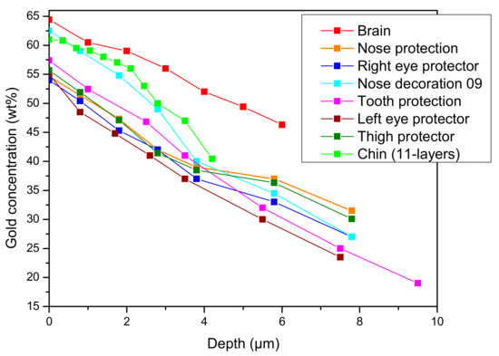 It is of interest to establish the minimum change in the concentration detectable in each layer. In order to determine this, the first upper layer and the last one were considered, and the gold content was changed one layer at a time. As expected, the minimum changes in the latter inner layer are higher than in the first layer. A minimum variation of 1% in the gold content is detected for the inner layer. This value decreases to 0.02% for the first layer, which is considerably lower than the corresponding statistical Poissonian error in the measured spectrum, intrinsic to the interaction phenomena. This confirms the high sensitivity of this approach. Based on this fact, it seems of interest to compare the Tumbaga profile of the sample examined here with others published in a previous paper [4]. The results are summarized in Figure 8. The gradient profiles can be grouped into two sets: one composed of the Brain, Chin, Tooth protection, Eye protectors, Nose decoration 09 and Nose protection samples (see ref. [4] for the description and pictures), while the other forms a separate set. Clearly, all the samples represented in Figure 8 are similar and all are Tumbaga. However, while the gradient profile is similar, some of them exhibit a higher surface concentration of gold (Brain, Nose decoration09 and Chin), indicating better depletion action. In one case, the Brain sample, this is due to the different alloy containing more gold.