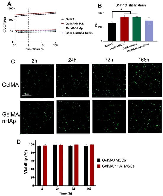 (A) Amplitude sweep and (B) storage modulus (G′) value extracted at 1% shear strain and visualized in columns for easier identification of differences. * Storage modulus (G′) at 1% shear strain was significantly higher for GelMA/nHAp and cell-laden GelMA hydrogels compared to GelMA hydrogel alone. Here, average of n = 3 ± SD is shown; (C) viability of GelMA and GelMA/nHAp 1% cell-laden 3D printed constructs with cell density 1 × 106 cells/mL: live-dead staining with Calcein-Am (“green” or live cells) and EthD-1 (“red” or dead cells); (D) Cell viability (%) for cellular and acellular printed constructs at different time points.