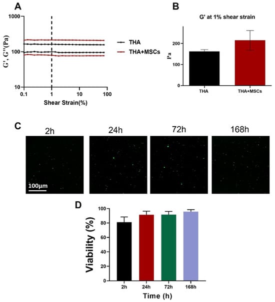 (A) Amplitude sweep of THA bioink with 2.5 × 106 hMSCs/mL; (B) Value of storage modulus (G′) extracted at 1% shear strain visualized in columns for easier identification of differences. Here average of n = 3 ± SD is shown; (C) Cell viability of THA 3.5% w/v cell-laden 3D printed construct with cell density 2.5 × 106 cells/mL live-dead staining with Ca-AM (green, live cells) and EthD-1 (red, dead cells); (D) Cell viability (%) for cell-laden THA constructs at different time points.