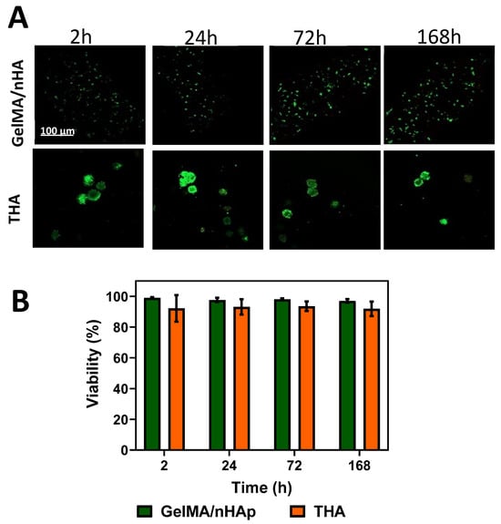 Cell viability of GelMA/nHAp and THA 3D printed constructs: (A) live-dead staining with Calcein-AM (“green” or live cells) and EthD-1 (“red” or dead cells) for hOBs embedded in GelMA/nHAp and chondrocyte micropellet encapsulated in THA hydrogel; (B) Cell viability (%) for both printed bioinks at four different time points.