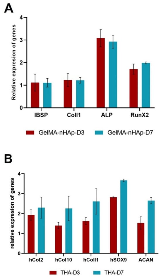 Bone and cartilage-specific gene expression: (A) For the 3D printed GelMA/nHAp and (B) THA constructs on day 3 and 7 (normalized on day 1).