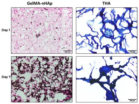 Histological results of GelMA/nHAp and THA 3D printed constructs at day 1 and day 7 after staining with Von Kossa and Toluidine blue stains, scale bar is 100 μm.