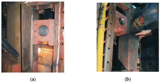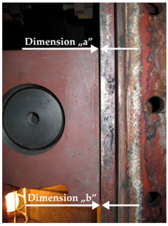 The correct installation of the guidance system and its appropriate adjustment during the mill’s operation period requires maintaining the mentioned construction gap in the range of 2 ± 1 mm. The gap width measurements were performed during scheduled mill inspections, i.e., approximately every 700–800 h of operation. In accordance with the technical and operational documentation, in order to assemble the guide set, the guidance chamber was opened, and the previous guide and active armour were demounted. Then, the guiding set with the sprayed coating was installed, Figure 3a, and the construction gap was established, Figure 3b. Before closing, the conduction chamber was sealed. The same procedure was followed for the set with the overlay welded layer.