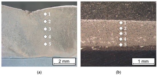 The hardness measurements of the overlay welded layer and the sprayed coating were carried out using the Vickers method at a load of 2.942 N, in accordance with the ISO 6507-1 [28] standard using the Future-Tech FM-ARS 9000 hardness tester with an automatic measurement line and an image analysis system (Future-Tech Corp., Kawasaki, Japan). Measurements were performed on the cross-sectional surface according to Figure 4.