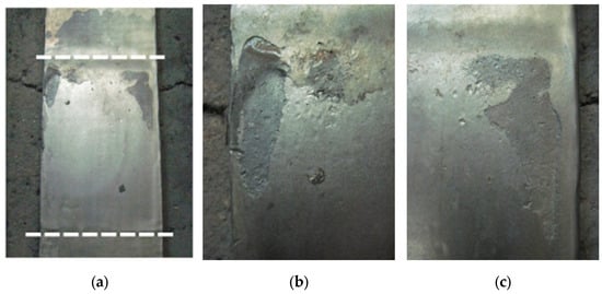 Active armour with a flame-sprayed coating after 1578 h of operation: (a) view of the coating with the working area of the friction pair marked (white-dashed lines) and (b,c) view of the coating in the areas with the greatest wear.