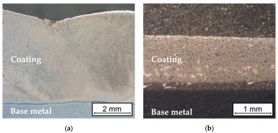 In order to determine the quality of layers and coatings, macro- and microscopic metallographic examinations were performed. Macro- and microscopic metallographic examinations were carried out on transverse metallographic sections for each sample using SZX9 and GX71 light microscopes from Olympus (Olympus Corporation, Shinjuku, Tokyo, Japan). Microscopic observations at higher magnifications were performed on a Hitach S-3400N scanning electron microscope (Hitachi, Ltd., Marunouchi, Chiyoda, Tokyo, Japan). The porosity of the thermal sprayed coating was determined based on the analysis of ten microstructure images at ×200 magnification using the Special AnalySIS pro program, version JMP9 (JMP Statistical Discovery LLC, Cary, NC, USA).