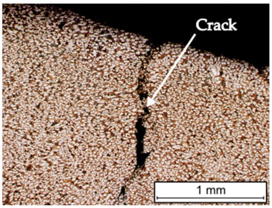 The cracks were found in the overlay welded layer (Figure 8), which ran perpendicular to the direction of deposited beads and did not penetrate the base material. These types of cracks (relief-check cracks) enable the relaxation of stresses arising from the solidification and cooling of the layer during the overlay welding process. In surfaced layers with chromium cast iron alloys intended for operation in abrasive wear conditions with low-impact loads, cracks are permissible if they do not penetrate the base material, are not oriented parallel to the fusion surface, and do not lead to the detachment of fragments of the welded layer [30,31,32]. In tribological tests, where abrasion occurs under high pressures or significant impact loads, the uneven wear of the weld deposits could occur as a result of fragments being chipped off [9,30]. No cracks were observed in the sprayed coatings. Both overlay welded layers and thermal sprayed coatings are properly bonded to the substrate material. The sprayed coating was completely melted, which proves that the melting process was carried out correctly [22,33]. There was no melting of the surface of the base material of samples flame-sprayed with the powder. The coating had a homogenous and non-lamellar structure, which is characteristic of sprayed coatings [34].