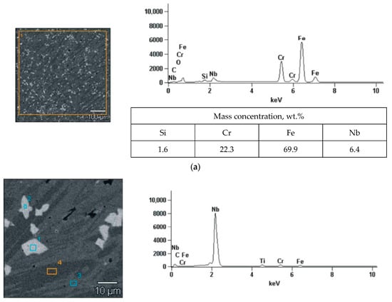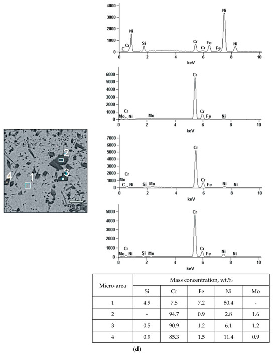 The analysis of the chemical composition in the micro-areas of the samples was performed using a Hitach S-3400N scanning electron microscope (Hitachi, Ltd., Marunouchi, Chiyoda, Tokyo, Japan) equipped with a Noran SYSTEM SIX EDS spectrometer (Thermo Fisher Scientific Inc., Waltham, MA, USA).