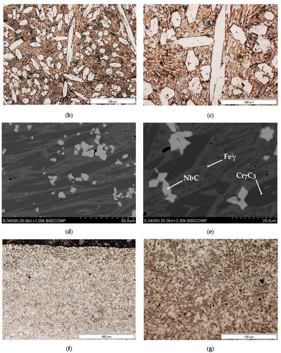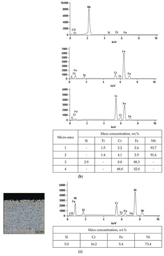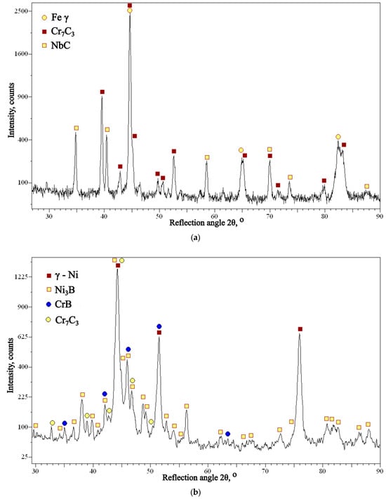 Based on the analysis of the chemical composition (Figure 9) and the identification of the phase composition (Figure 10), as well as microscopic metallographic examinations (Figure 11), it was possible to conclude that the overlay weld had a structure composed of larger Cr7C3 carbides and smaller NbC carbides in an austenite matrix. The sprayed coating consisted of CrB borides and Cr7C3 carbides in a matrix of γ-Ni solid solution and Ni3B. According to Kim et al. [35], melting the sprayed Ni-Cr-B-Si-C coating results in obtaining CrB and Cr7C3. The analysis of the chemical composition in micro-areas (Figure 9) indicated the occurrence of Si mainly in the matrix of the γ-Ni solid solution.