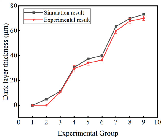- The experimental and simulated dark layer thickness values were compared, and the error was 9.8%, which verified the validity of the finite element model.