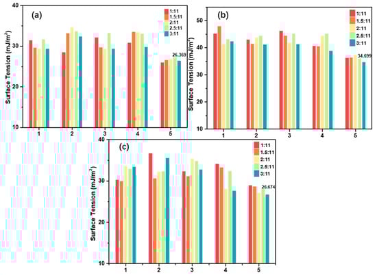 The surface tension of fluorosilicone/polyester resins without additives. (a) HLR-Si/polyester resins. (b) AG-2AF/polyester resins. (c) AG-109F/polyester resins. 1–5 stand for polyester resins 1265XL, YP2224, FS-2970B, FS-4660, and FS-4470, respectively.