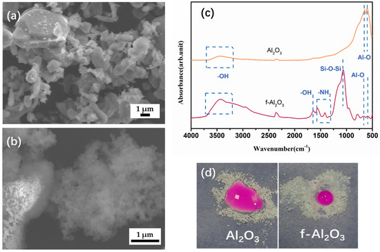 The morphologies of Al2O3 were characterized by scanning electron microscopy (SEM, Hitachi, Tokyo, Japan). The chemical bonding states of the functionalized Al2O3 were analyzed by Fourier-transformed infrared spectroscopy (FTIR, Thermo Fisher Nicolet, Waltham, MA, USA).
