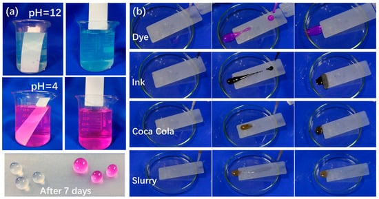 Resistance to acid, alkali, and corrosion, as well as anti-stain properties, are additional requirements for protective coatings. In Figure 4a, for better observation, hydrochloric acid solution (pH = 4) and sodium hydroxide solution (pH = 12) were prepared with blue and pink dyes, respectively. The prepared low-surface-energy coatings were immersed in acidic and alkaline solutions for 7 days. The results indicate that, after one week of immersion, the surface remained in its previous state with no color adhesion. The droplets on the coating surface in both corrosive solutions maintained a spherical shape, indicating that the coating exhibited good long-term mechanical stability under corrosive conditions.