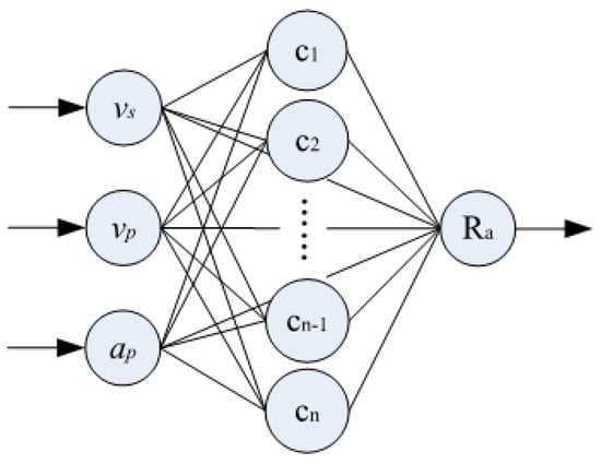 There are three structural layers in the network used in this study. The first layer is used to input the machining parameters. In the second layer, the Gaussian function was used as the activation function to process the input parameters non-linearly. The third layer is the output layer to output the final roughness prediction results. This is shown in Figure 2.