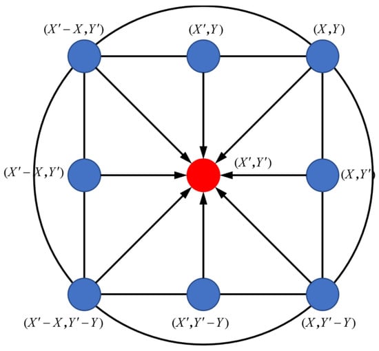 where t is the number of iterations, Xp(t) is the position vector of the prey, and X(t) is the position vector of the grey wolf. The schematic diagram of its surroundings is shown in Figure 3.