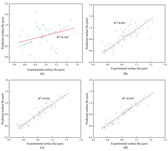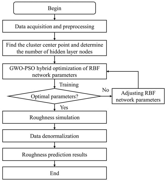 In recent years, with the advancement of intelligence, numerous sophisticated algorithms have been employed to forecast the surface roughness of workpieces and enhance their predictive power. The causes of high and low surface roughness, as well as roughness prediction and modeling, have currently been developed as a near-complete theoretical system [10,11,12]. Tian et al. [13] developed a prediction model for the association between different process factors and workpiece surface roughness using a BP neural network based on the experimental results. Li et al. [14] constructed a state parameter prediction model based on the BP neural network by performing grinding tests on samples of nickel-based superalloys, and the prediction accuracy of the model is 93.58%. Qi et al. [15] took the maximum cutting depth of the belt, the speed of the belt, and the feed rate of the workpiece as input parameters to establish the prediction model of polishing surface roughness of the belt based on the BP neural network. The results show that the predicted value is in good accordance with the experimental value. Different from the BP neural network, the RBF neural network [16,17,18] utilizes the Gaussian activation function, which can address some of the issues with the BP neural network, such as the lengthy training period, ease of local optimum, and so on. It can generalize well, make predictions quickly, and adapt better to various types of data.