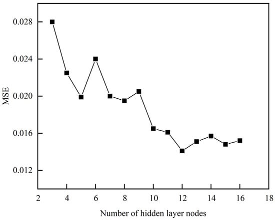 According to Equation (20), the range of the number of nodes in the middle layer can be roughly determined as [3,12]. Therefore, the influence of the number of nodes in the interval 3–16 on training error (MSE) was explored. Figure 5 shows the correspondence between the training error size and the number of hidden layer nodes. It can be seen that the training error tends to decrease with the increase in the number of nodes in this range, and the minimum error is obtained when the number of nodes is set to 12. When the number of nodes is greater than 12, the error increases slowly. Therefore, the number of nodes is determined to be 12.