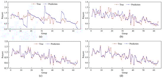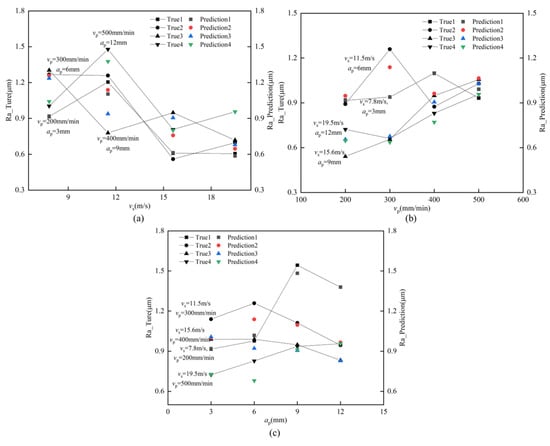 With the grinding parameters and the control variable technique, we exhibit the actual as well as the expected roughness in Figure 8. It can be found that when the belt linear speed is low under the condition of high feed speed and grinding depth reduction, large scratches appear on the grinding surface due to uneven grinding, machine vibration, and other factors (Figure 9b). When the belt linear speed and feed speed are high, the lower grinding depth occurs, and the uneven surface pits are produced by grinding due to the existence of factors such as grinding shedding and adhesion (Figure 9a). Due to the existence of these uncertainties, the predicted value learned by the model has a large error from the true value. It is worth noting that the proposed model has a better prediction effect on the whole.