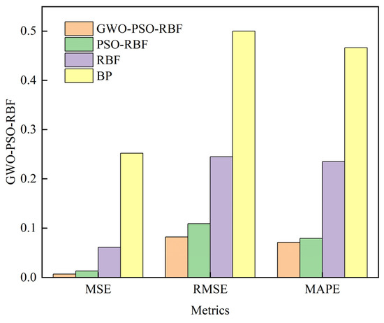 By observing Figure 10, we can see that the single BP model has the worst three accuracy parameters and the lowest prediction accuracy. The prediction accuracy of the RBF neural network model is better than that of the BP neural network model, but the accuracy is still low. In general, whether it is PSO-RBF or GWO-PSO-RBF neural network, the prediction error index of the hybrid model is better than that of the single neural network model, indicating that the accuracy of the hybrid model combined with the optimization algorithm is higher than that of the single neural network prediction model. In addition, the proposed GWO-PSO-RBF neural network is slightly better than the PSO-RBF neural network, maintaining a smaller prediction error.