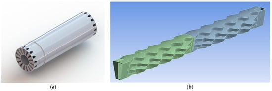 The simulated structural model is only a section of the whole recuperator to reduce the computational cost. More specifically, the geometry (Figure 1a) is considered axisymmetric, and the simulated section represents 1/15 of the whole geometry (Figure 1b). The CAD model has been defeatured (mainly by the removal of fillets) to allow high-quality mesh to be generated.