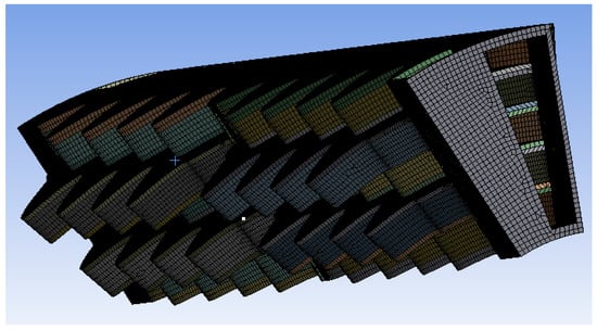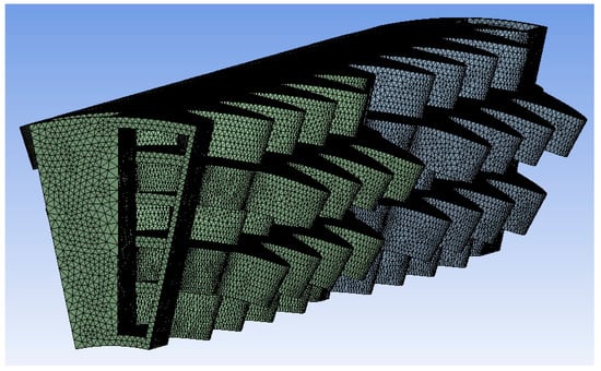 The mesh strategy aims at adequately capturing the bending of the recuperator walls; two meshing strategies were implemented, one using tetrahedral elements (1,647,873 elements) and one using hex-dominant elements (364,566 elements), in order to ensure mesh independence. The final mesh is presented in Figure 4 and Figure 5, respectively.