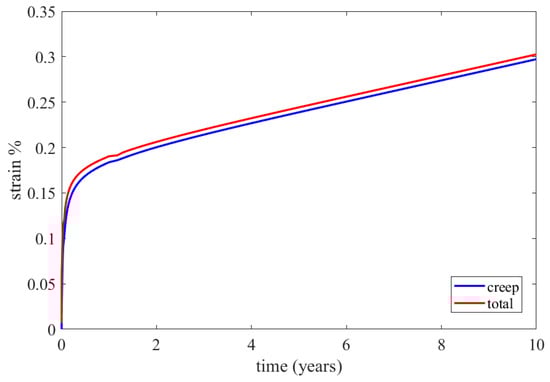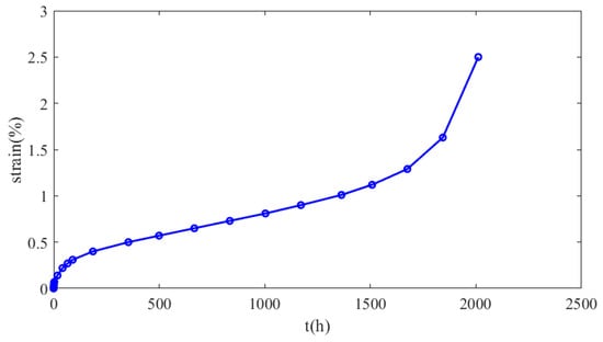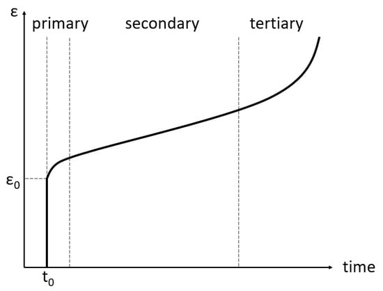 The behaviour of creep can be divided into three stages, as presented in Figure 6. In the primary stage, the strain rate decreases exponentially over time until it reaches a constant value. This constant strain rate defines the secondary stage or steady-state creep. Finally, in the tertiary creep stage, the strain rate exponentially increases, eventually leading to failure.