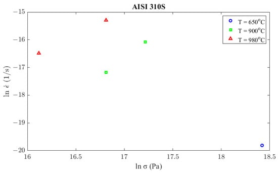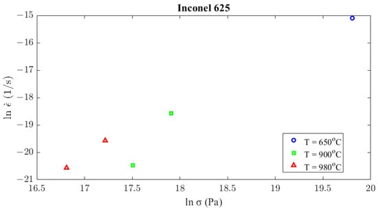 The stress exponent, , can be determined above 740 °C at 900 °C and 980 °C, similarly to the aforementioned case of Inconel 625