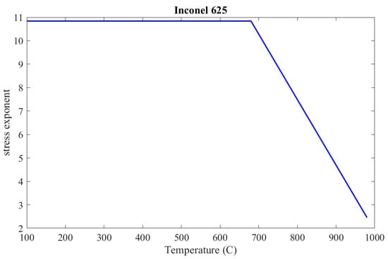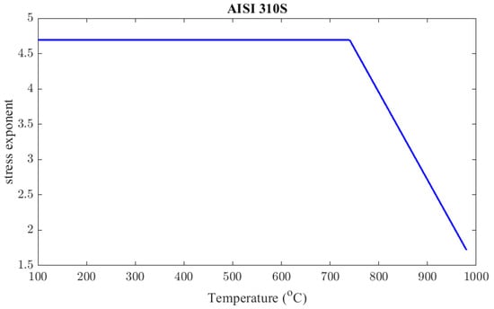 From the results in (15) and assuming that the stress exponent is decreasing linearly as the temperature increases [35], in the range from the critical temperature to 980 °C, the stress exponent, as a continuous function of temperature, can be determined according to Formula (16), which is illustrated in Figure 10.