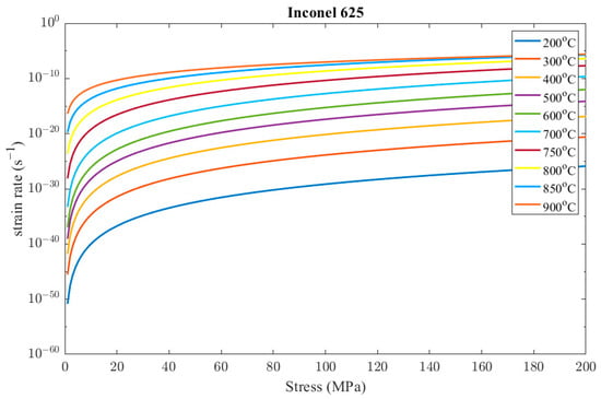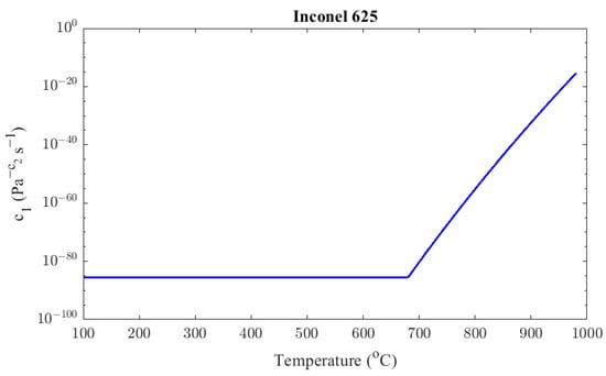 Frost and Ashby [31] reported that the value of Nickel activation energy is 170 kJ/mol. Moore et al. [32] found different values of self-diffusion activation energy for the Inconel 625 alloy depending on the temperature. The value of the activation energy obtained was 108.3 ± 6.6 kJ/mol above 700 °C and 46.6 ± 12.2 kJ/mol below 650 °C. Between 650 and 700 °C, a significantly higher value of the activation energy equal to 527.7 ± 23.1 kJ/mol was found. The activation energy value found from de Oliveira et al. [33] was 407 kJ/mol. Son et al. [19] calculated that the creep activation energy of the AM-produced Inconel 625 is 273 kJ/mol, and the creep activation energy of wrought Inconel 625 is 284 kJ/mol. The calibrated value for the reference wrought Inconel 625, as indicated by Graca et al. [34], is 275 kJ/mol, and it is very close to that of the AM-produced Inconel 625. The activation energy for the current study was taken to be equal to 27 5 kJ/mol. Hence, the parameter is given by Equation (12).