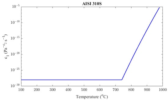 From Equations (14) and (17), it can be concluded that the factor c1 increases exponentially with the rise of temperature. Hence, it can be described as a function of temperature with the following form: