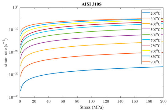 where is the apparent activation energy, is the gas constant, and is the temperature. As a consequence, from Equations (3) and (4), the strain rate, could be obtained from Equation (5) (Norton Law)